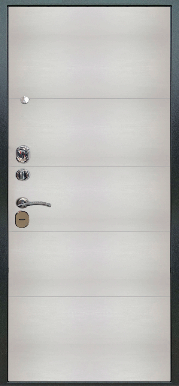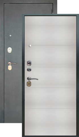 Повышенной надежности российская дверь со стильной внешней отделкой муар черный и красивой декоративной панелью толщиной 12 в цвете вельвет белый горизонт. Прекрасно подойдет для установки в квартиру. Солидная модель, которая хорошо защитит и подчеркнет статус.