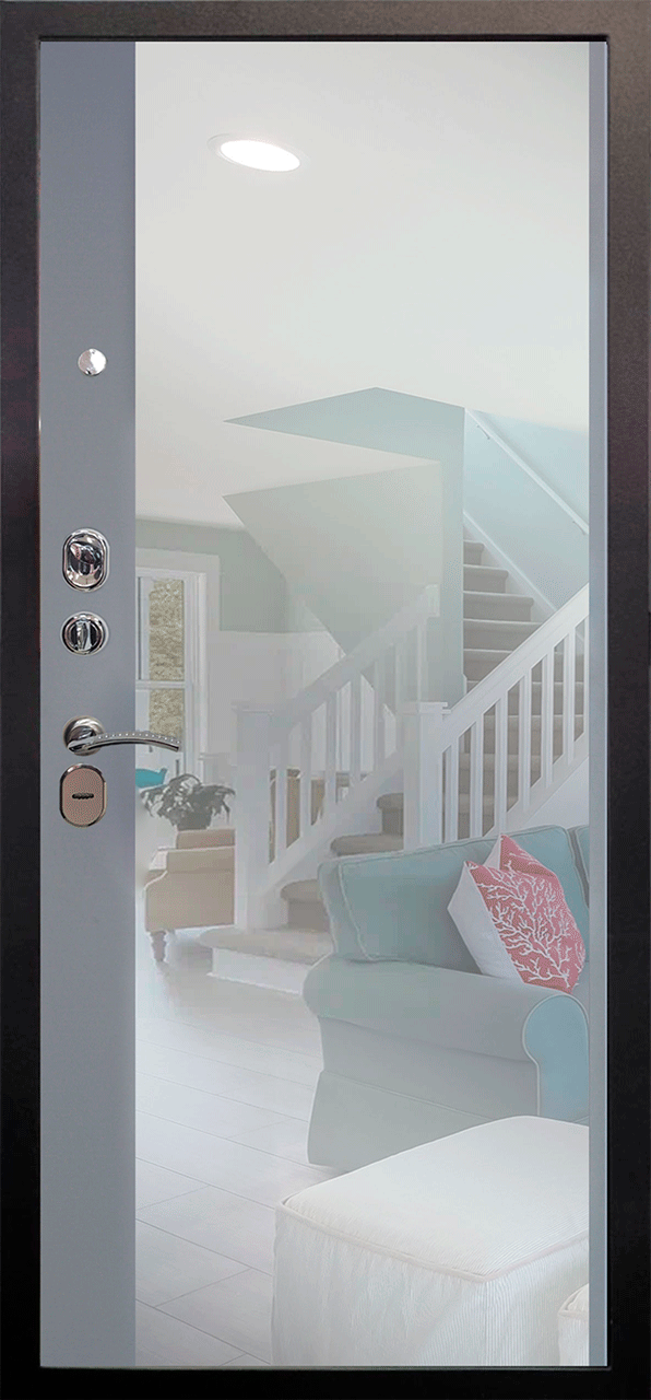Повышенной надежности российская дверь с большим зеркалом на внутренней панели. Прекрасно подойдет для установки в квартиру. Солидная модель, которая хорошо защитит и подчеркнет статус.