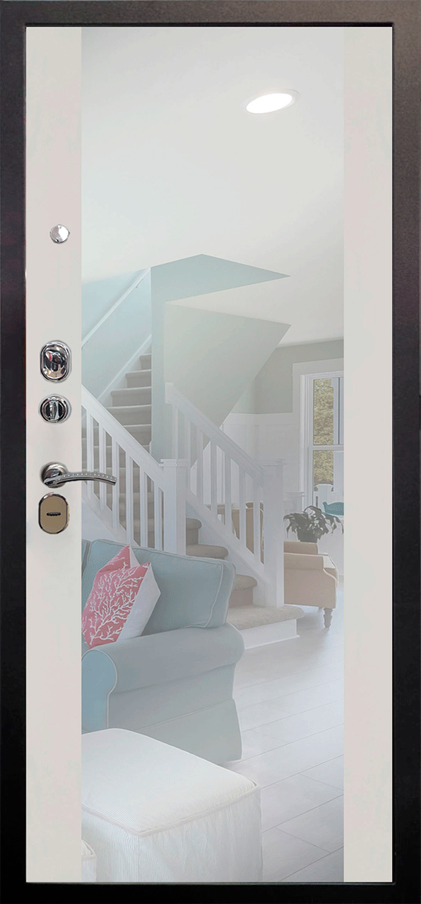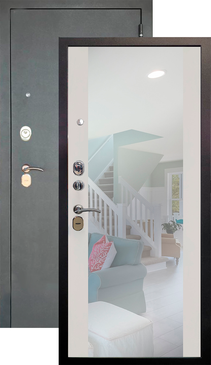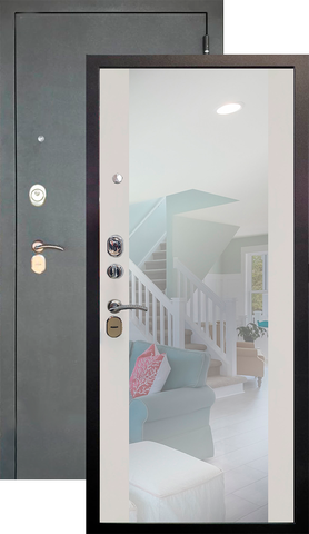 Повышенной надежности российская дверь с большим зеркалом на внутренней панели со стильной внешней отделкой муар черный. Прекрасно подойдет для установки в квартиру. Солидная модель, которая хорошо защитит и подчеркнет статус.