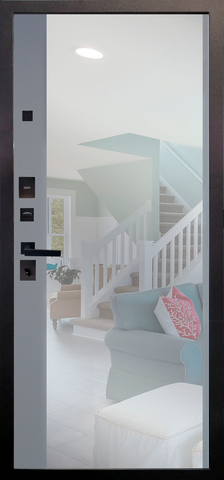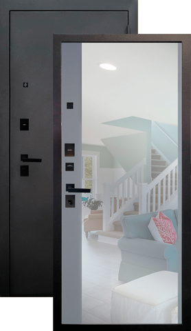 Повышенной надежности российская сейф-дверь с большим зеркалом на внутренней панели со стильной внешней отделкой муар черный. Прекрасно подойдет для установки в квартиру. Солидная модель, которая хорошо защитит и подчеркнет статус.