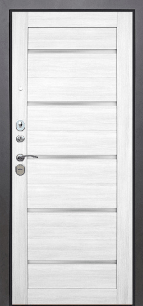 Имеет очень высокую прочность, благодаря толстой стали 2 мм. Оснащена двумя надежными замками, минимум один из которых имеет высший класс взломостойкости по ГОСТ 5089-2003 (4 класс). Есть врезная броненакладка, защищающая цилиндровый замок от высверливания. Она утоплена в дверное полотно, поэтому ее практически невозможно сбить. Есть ночная задвижка — дополнительная защита от взлома. Никто не сможет зайти, вскрыв замок, когда вы дома.